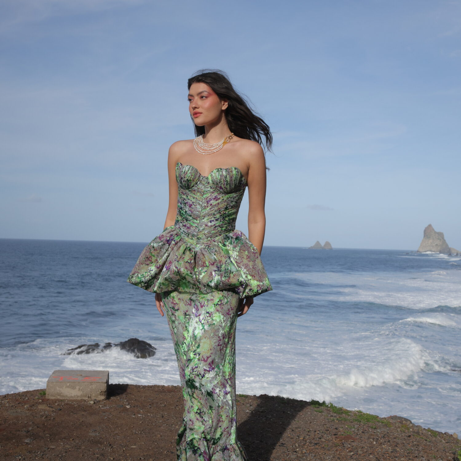 Confecționată din mătase naturală, rochia Azure a fost inspirată de mișcarea grațioasă a valurilor care se sparg la țărm, reflectând lumina soarelui în nuanțe metalizate de albastru profund. Parte din colecția Essence of the Earth 2025, această piesă celebrează conexiunea autentică dintre om și natură.