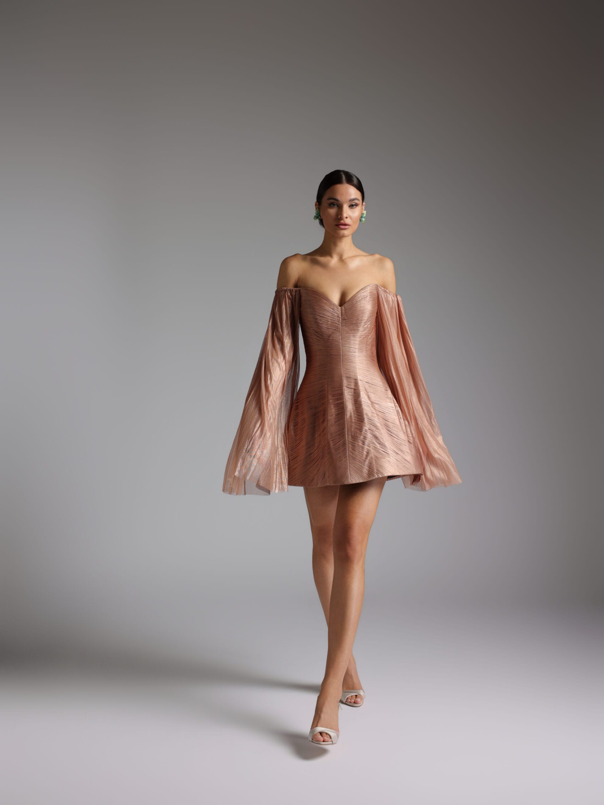 Rochie mini din tulle de mătase, cu bust tip corset, mâneci vaporoase și cupe aplicate, ce definesc o siluetă feminină și sofisticată. Închidere cu fermoar ascuns la spate si corset.