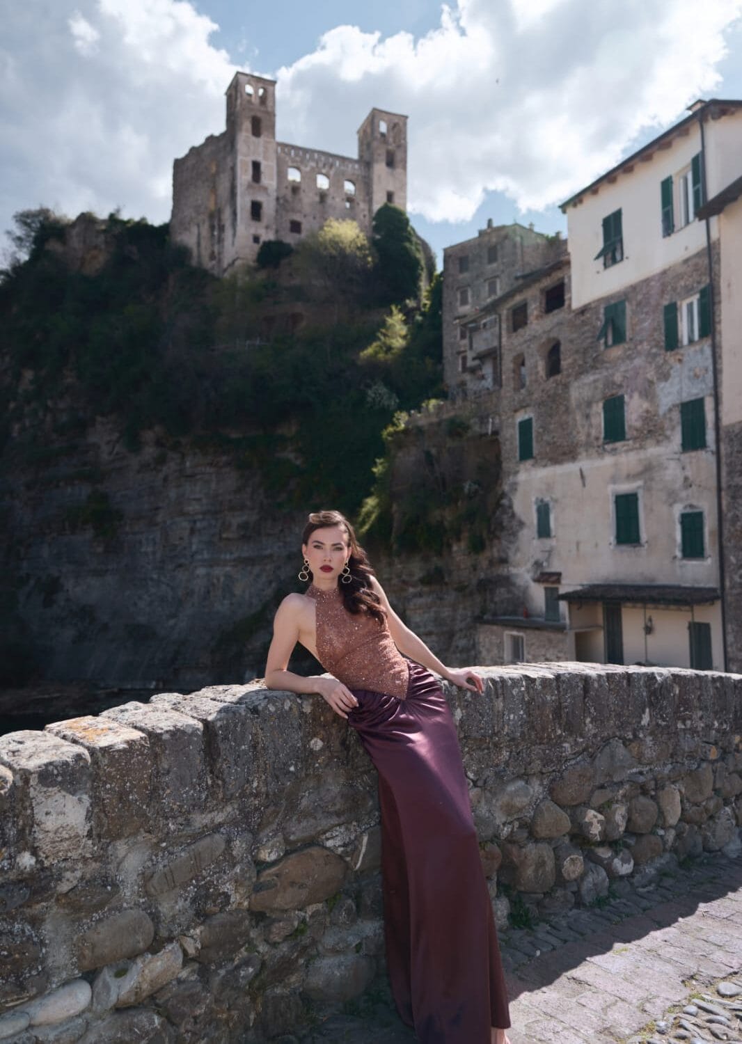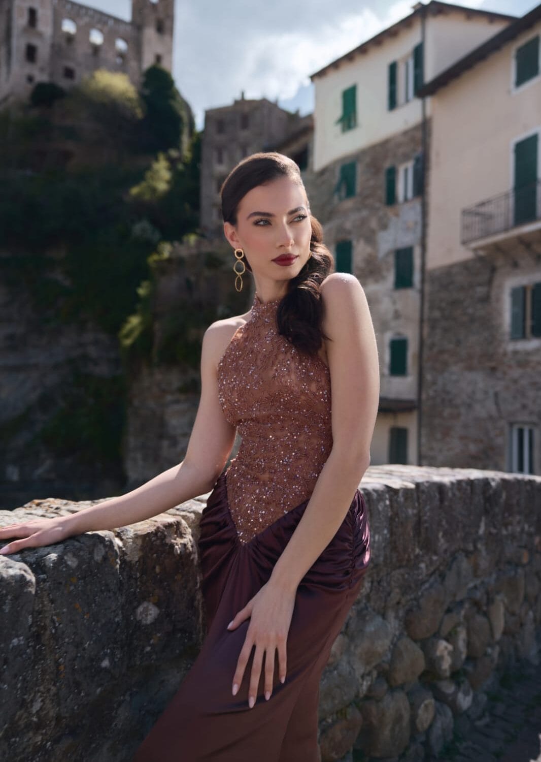 Ca o seara de vară, lejeră și delicată. Ca un apus de soare în care florile își ridică petalele către ultimii stropi de lumină. Așa este rochia Layla: un tablou renascentist, pastelat în care tulle-ul creează volumetrii și unduiri suave, iar petalele florilor, cusute cu iubire, strălucesc în atingerea perlelor și paietelor. Poart-o cu părul despletit și zâmbetul în privire, iar umerii lasă-ți-i răsfățați de împletirea caldă a bretelelor, pe care le-am creat cu gândul la tine.