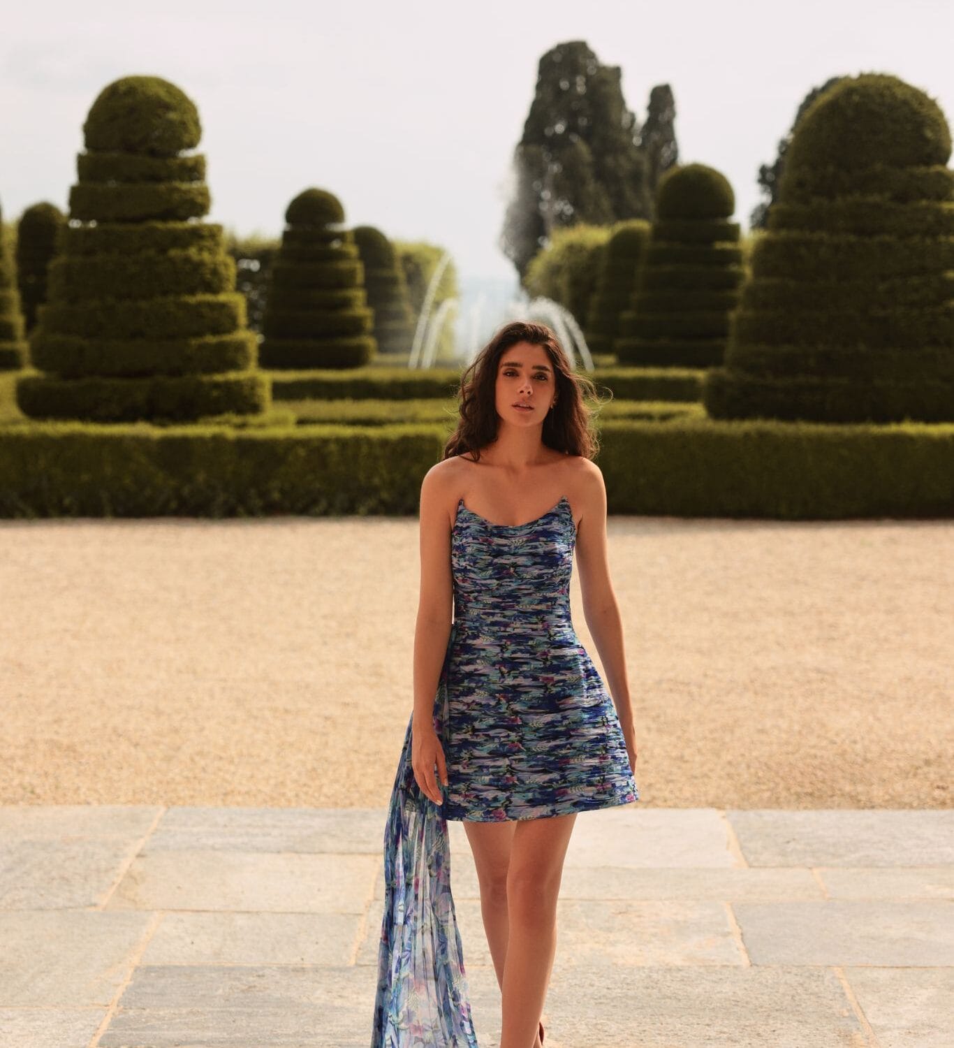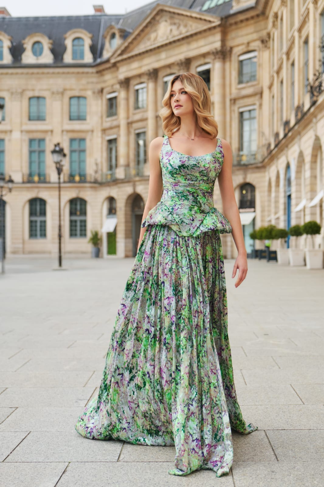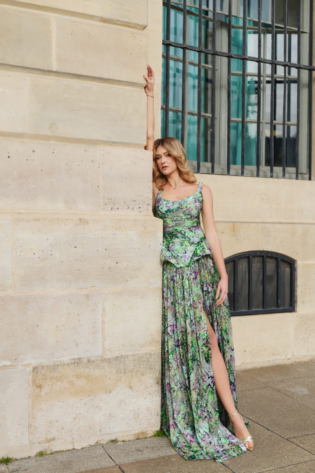 O combinatie echilibrata intre structura si fluiditate. Corsetul ofera sustinere si contur, iar fusta din matase, cu imprimeu floral, aduce lejeritate si miscare.