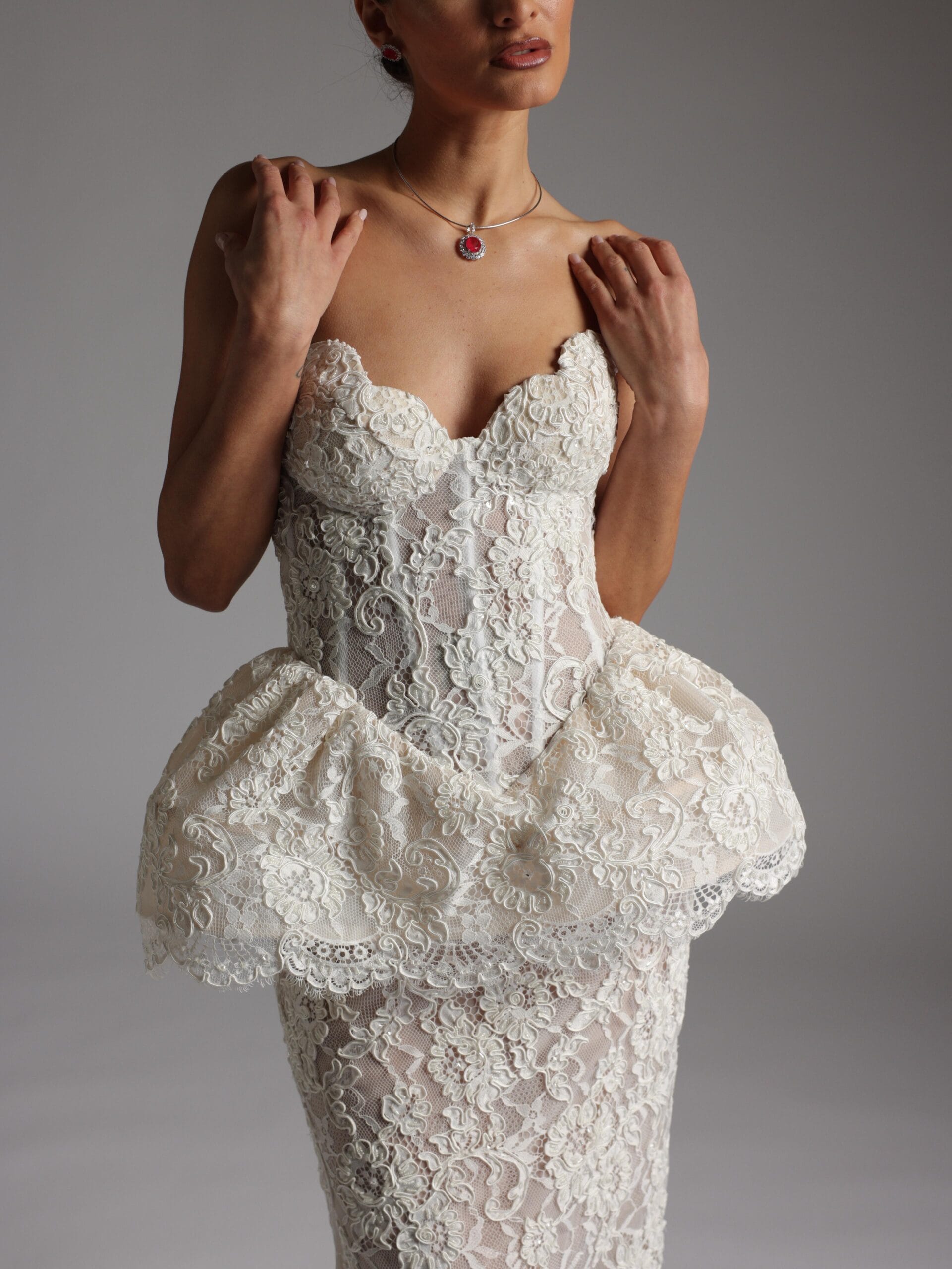A lace wedding dress for a bride dreaming of a romantic wedding.
