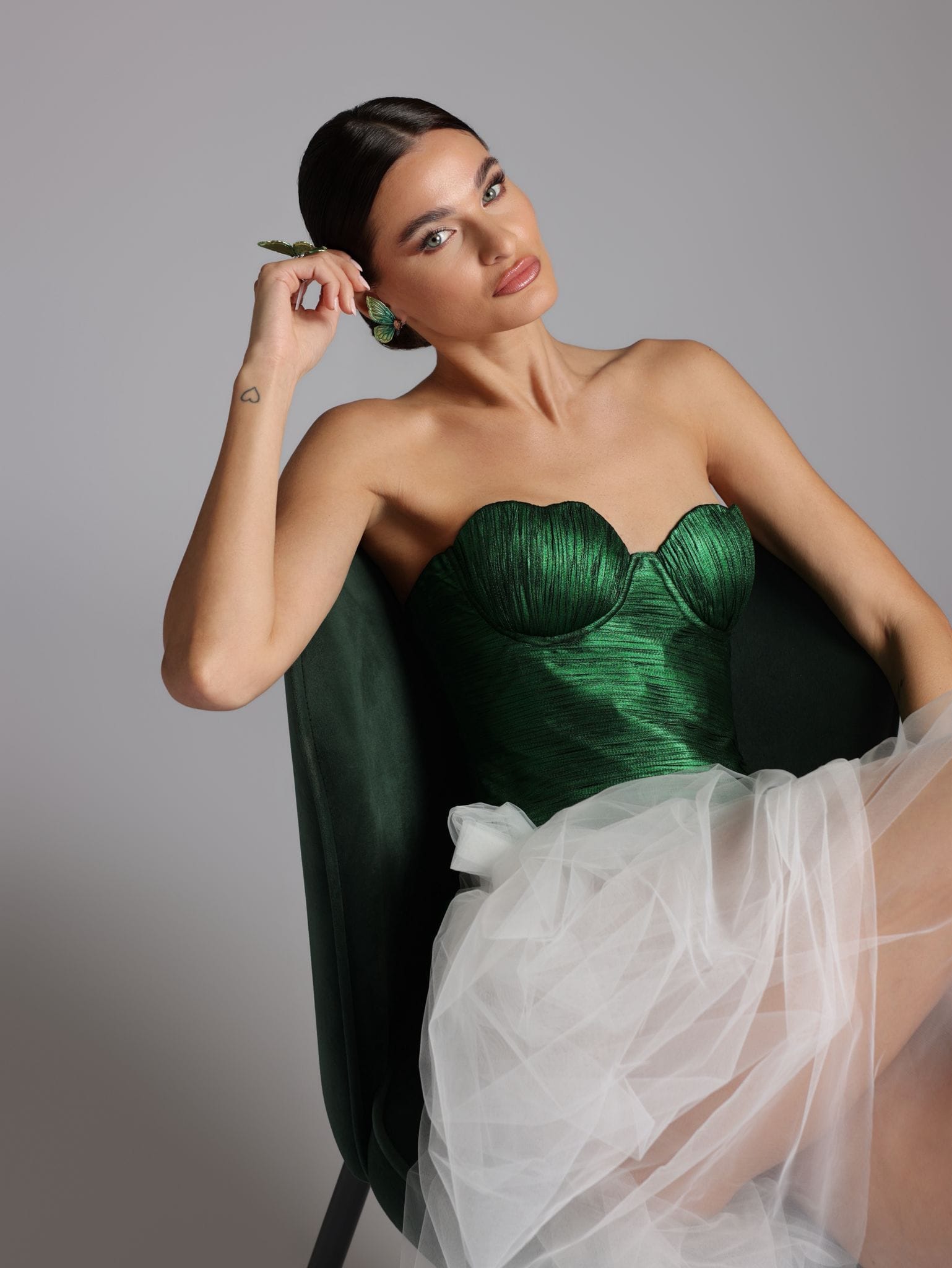 Corsetul este confecționat din tulle de mătase peliculizat. Designul fără bretele evidențiază linia bustului, în timp ce balenele de susținere oferă structură și stabilitate, sculptând elegant silueta. Spatele complet reglabil, prevăzut cu sistem de închidere tip corset, asigură o potrivire perfectă